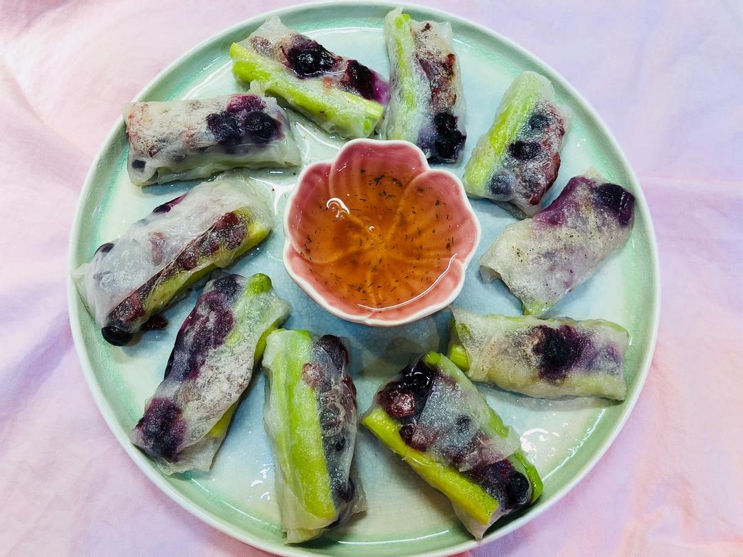 蓝莓、冰芦笋、蔓越莓包裹在薄滑软糯的越南春卷皮里,加点酸酸甜甜的酱汁很适合夏天哦! #午餐•2018年6...
