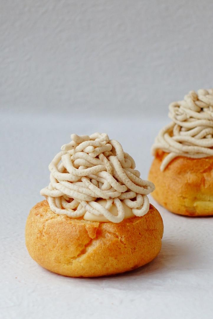 法式T55粉制作的 泡芙壳又酥又脆,不易回潮,夹入了卡士达奶油酱和栗子奶油酱,双重美味。