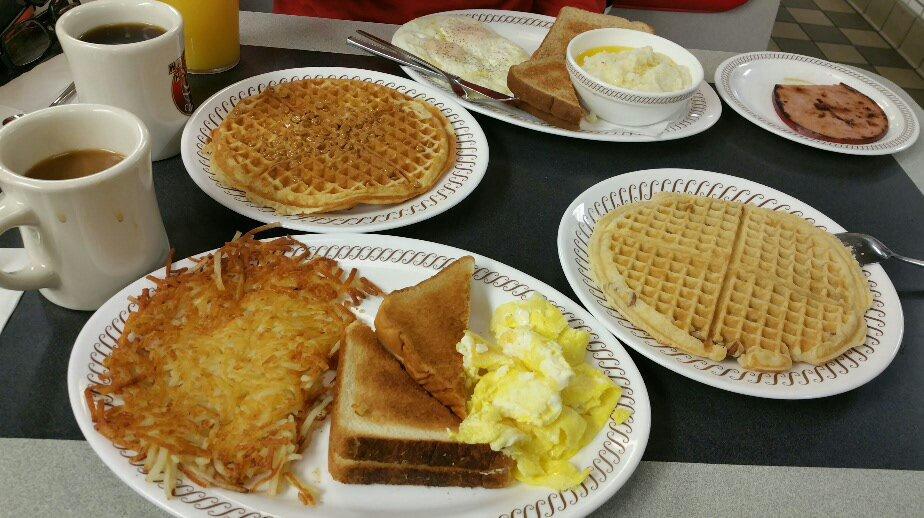 圣诞节当天的早餐。那天只有waffle house营业(除了麦当当)。他们家在华夫饼里加...