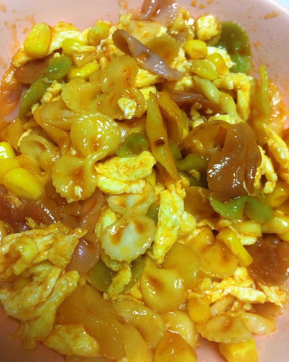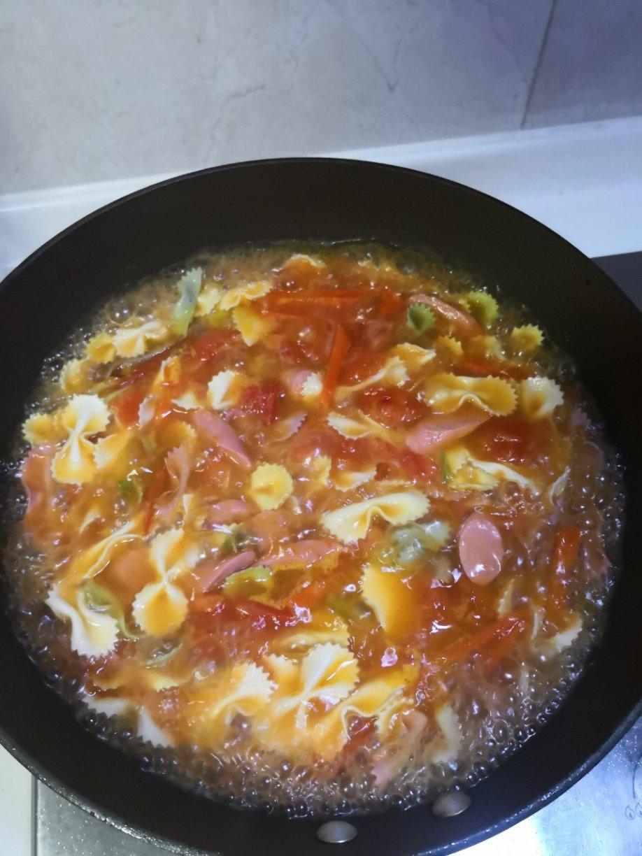 先炒西红柿,炒成汁炒胡萝卜还有肉丝,西红柿越多越好,加水,水开后放蝴蝶面,火腿肠。面好可盛。非常好吃,最爱番茄面!