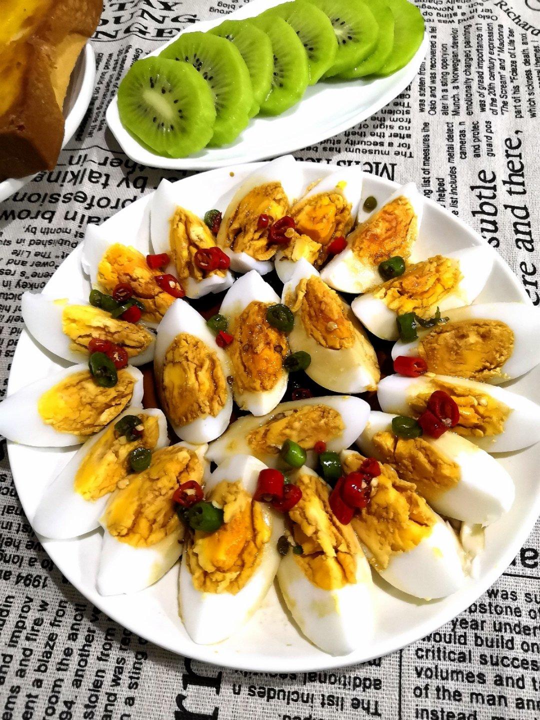 今日早餐:枣饽饽+烤肠+白煮蛋+咸鸭蛋+橙子+猕猴桃+慈梨膏奶茶