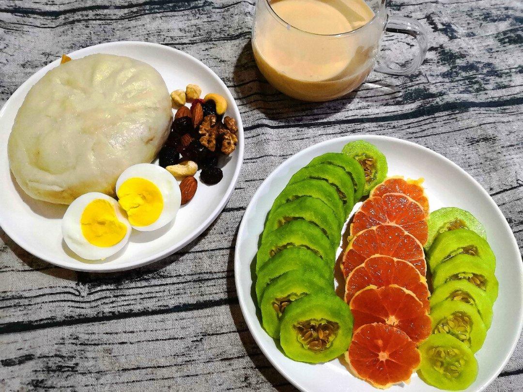 今日早餐:包子+鸡蛋+坚果+羊角蜜甜瓜+中华红橙+慈梨膏奶茶