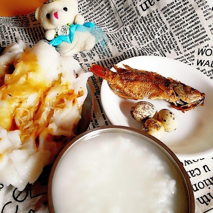 是日早餐:🌹自制豆芽猪肉肠粉+白粥+煎鱼+鹌鹑蛋