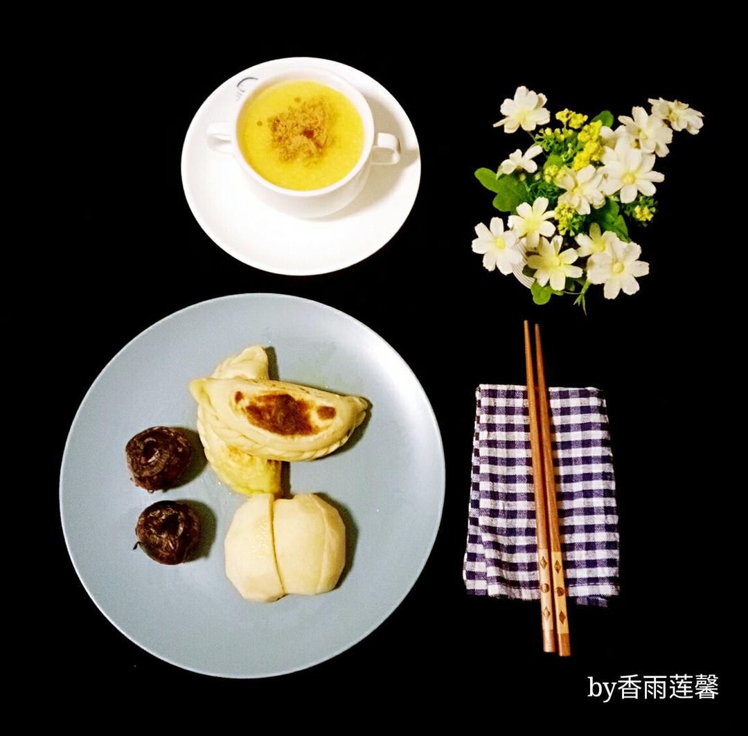 ——今日早餐: 韭菜盒子+肉松玉米渣粥+梨+马蹄。老爸在舅舅家挖的马蹄,小的...