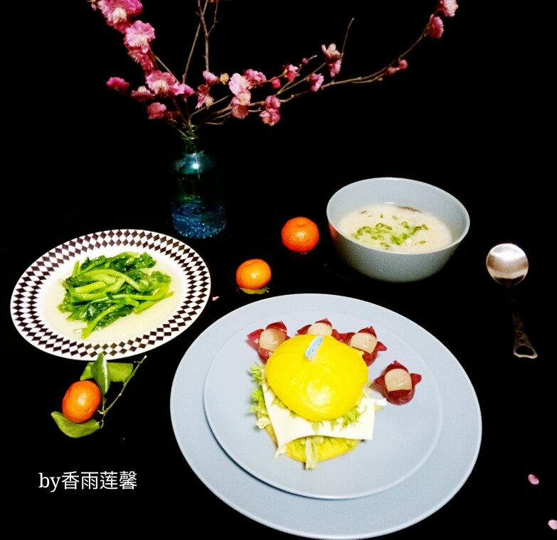 ——中式汉堡+皮蛋瘦肉粥+清炒菜心+红提+沙糖桔。创造存在价值,进而创造美好价值...