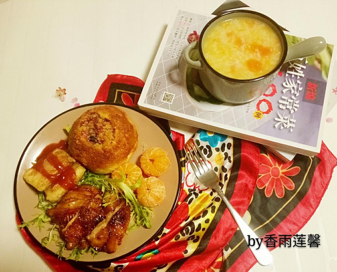 ——烤鸡腿+脆皮豆腐+蓝莓餐包+沙糖桔+南瓜粥。生命就是关系,改善关系,就能改变...