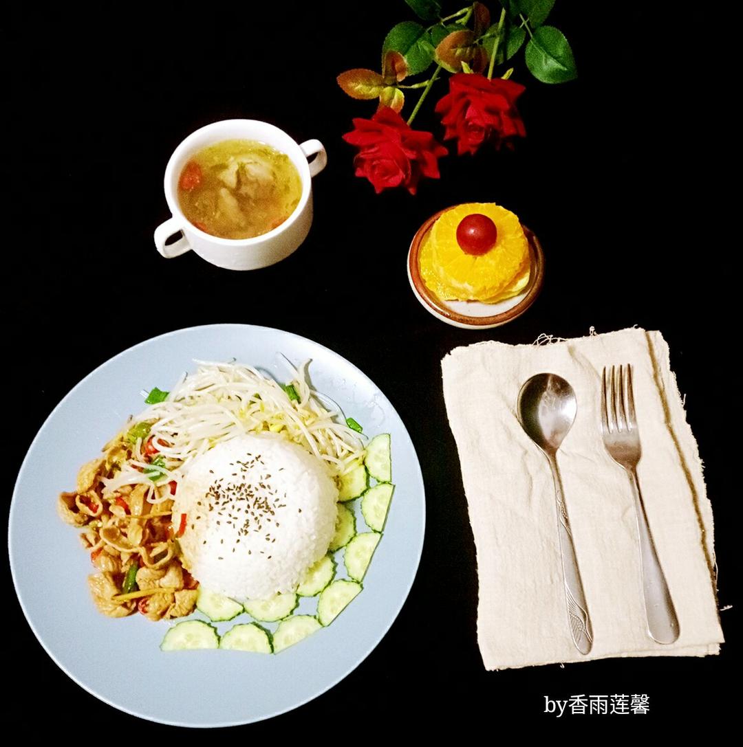 ——培根炒饭+虫草乌鸡汤+红心火龙果