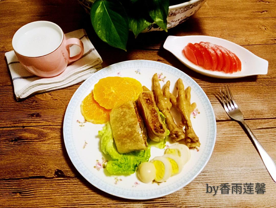 ——脆皮手抓饼+卤鸡爪+卤蛋+凉拌西红柿+橙子+椰汁。——生命因爱而来,世界因爱...