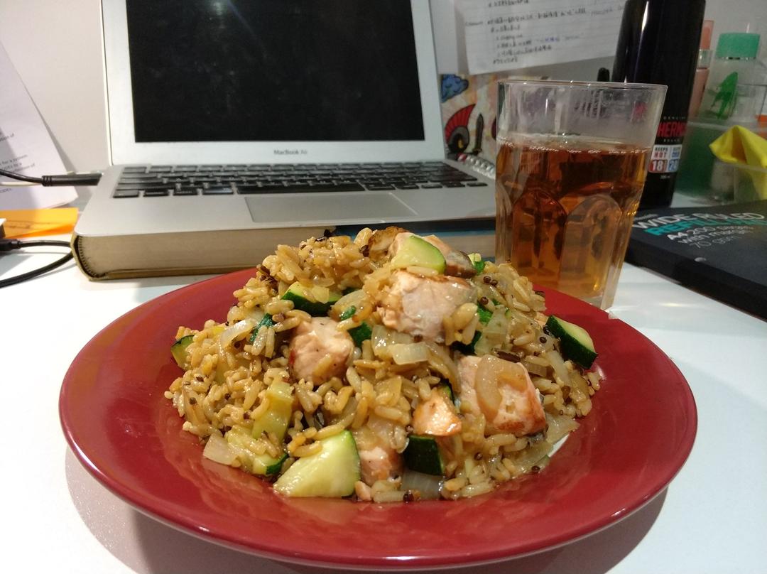 午饭 三文鱼120g蔬菜(西葫芦洋葱250g)炒杂粮饭(100g)