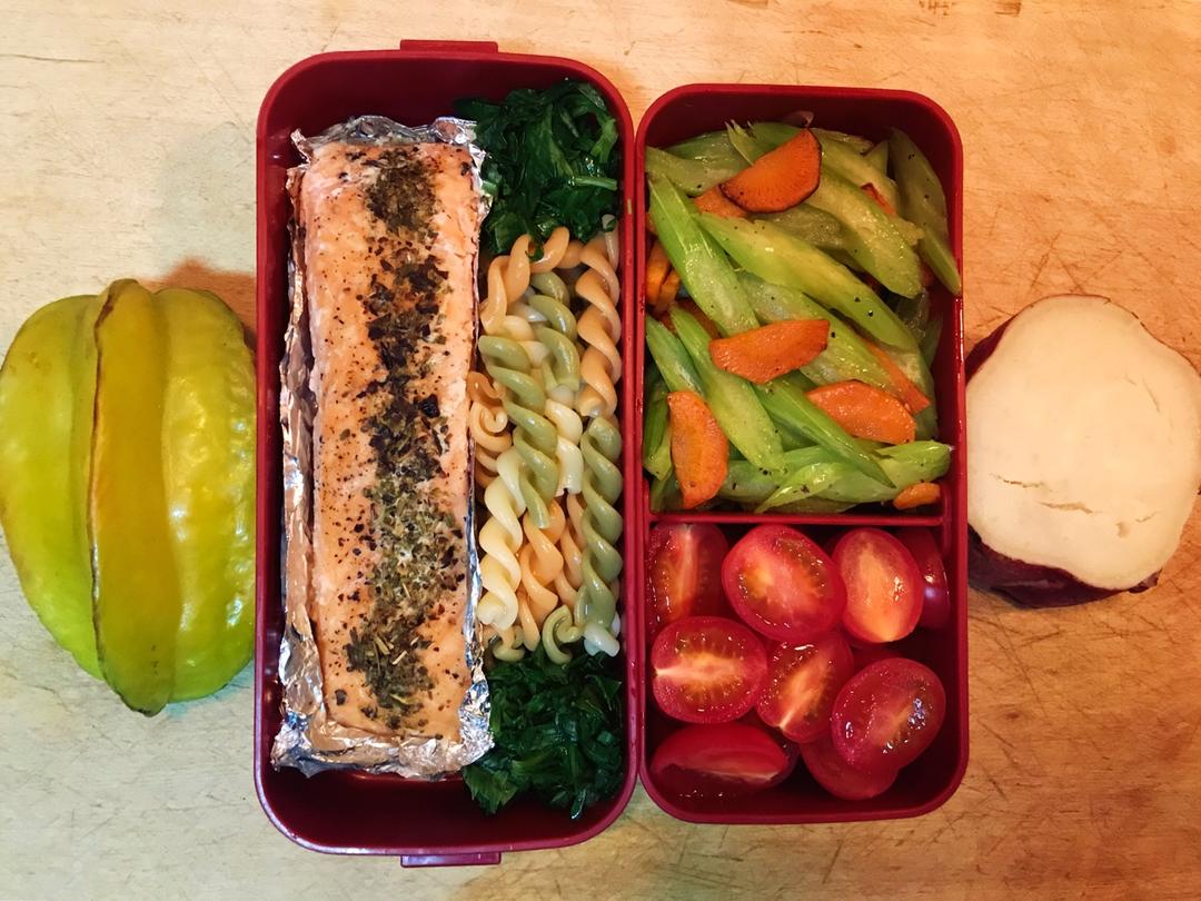 最近休息不好,头疼,少了运动,饭还是要认真吃!主餐:烤三文鱼+通心粉,配餐:芹菜炒胡萝卜+🍅,天气冷感冒的人好多,要多吃...