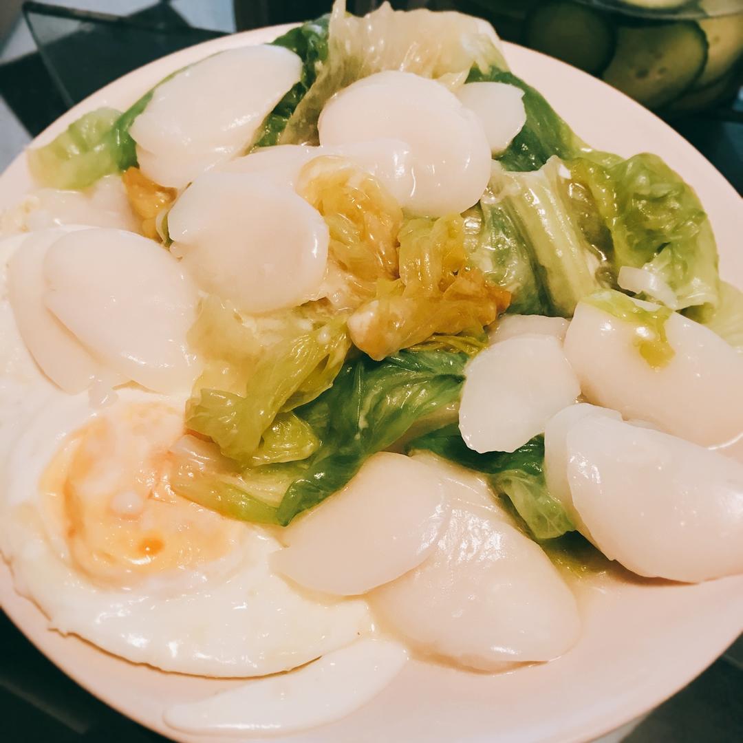 生菜鸡蛋芝士炒年糕~蛋白和年糕都白白的,色差出不来🤔但真的超级好吃!!