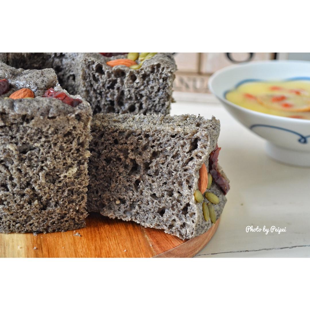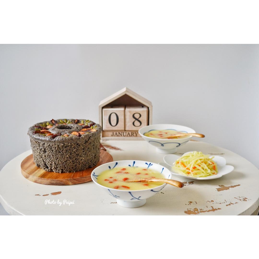 二人晨食~黑芝麻发糕、炝拌土豆丝、枸杞玉米面粥~