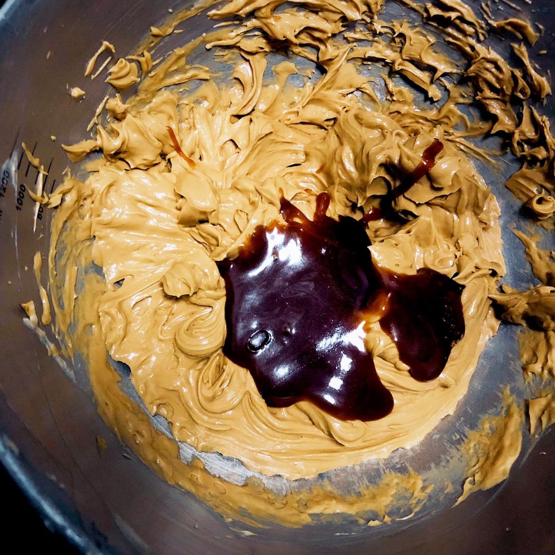 组合食材:加了奶粉的焦糖咖啡+好时黑巧克力+熟透的香甜大香蕉+黄油鸡蛋。