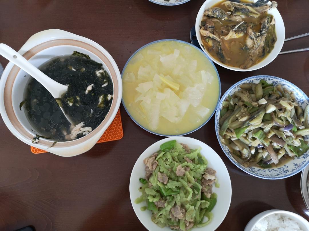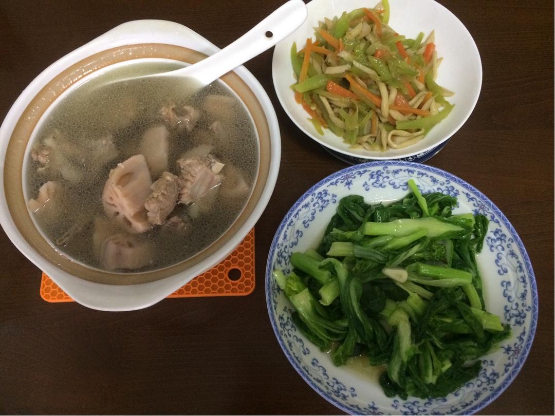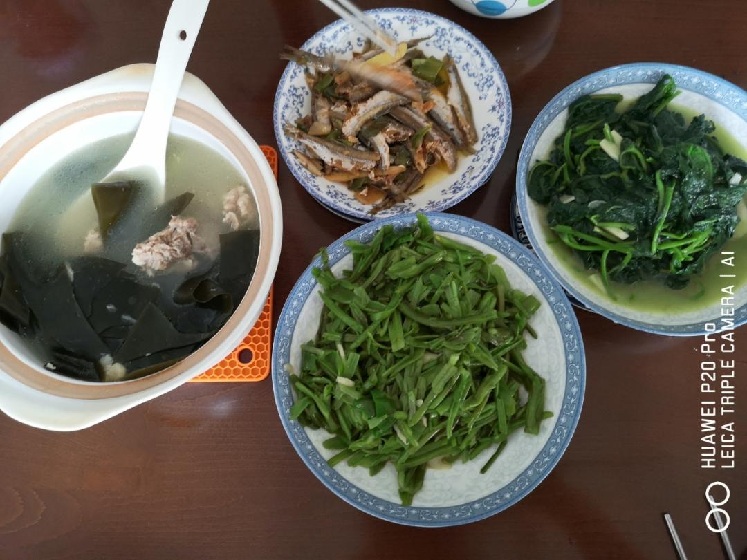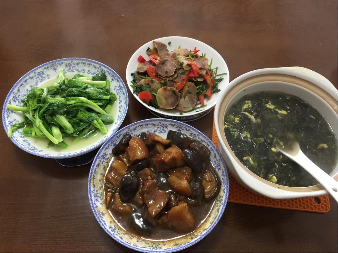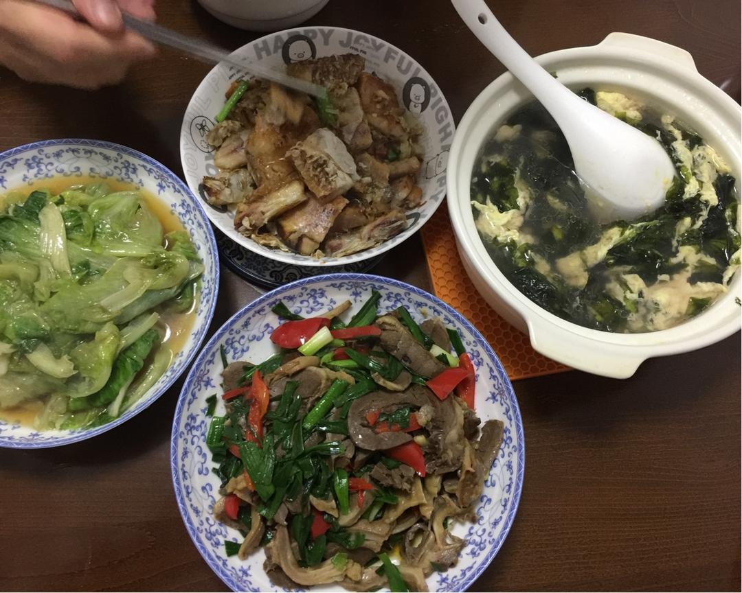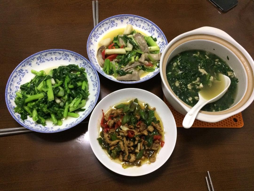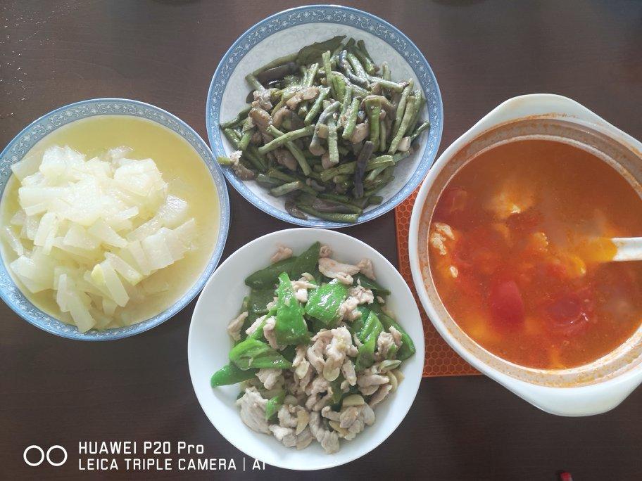 莴苣鸡蛋汤味道挺好,但是一放久了颜色就不鲜亮了;农家小炒肉好吃,这次用的瘦肉,下次换成五花肉;中午剩的猪肚用蒜苗和几根芹...