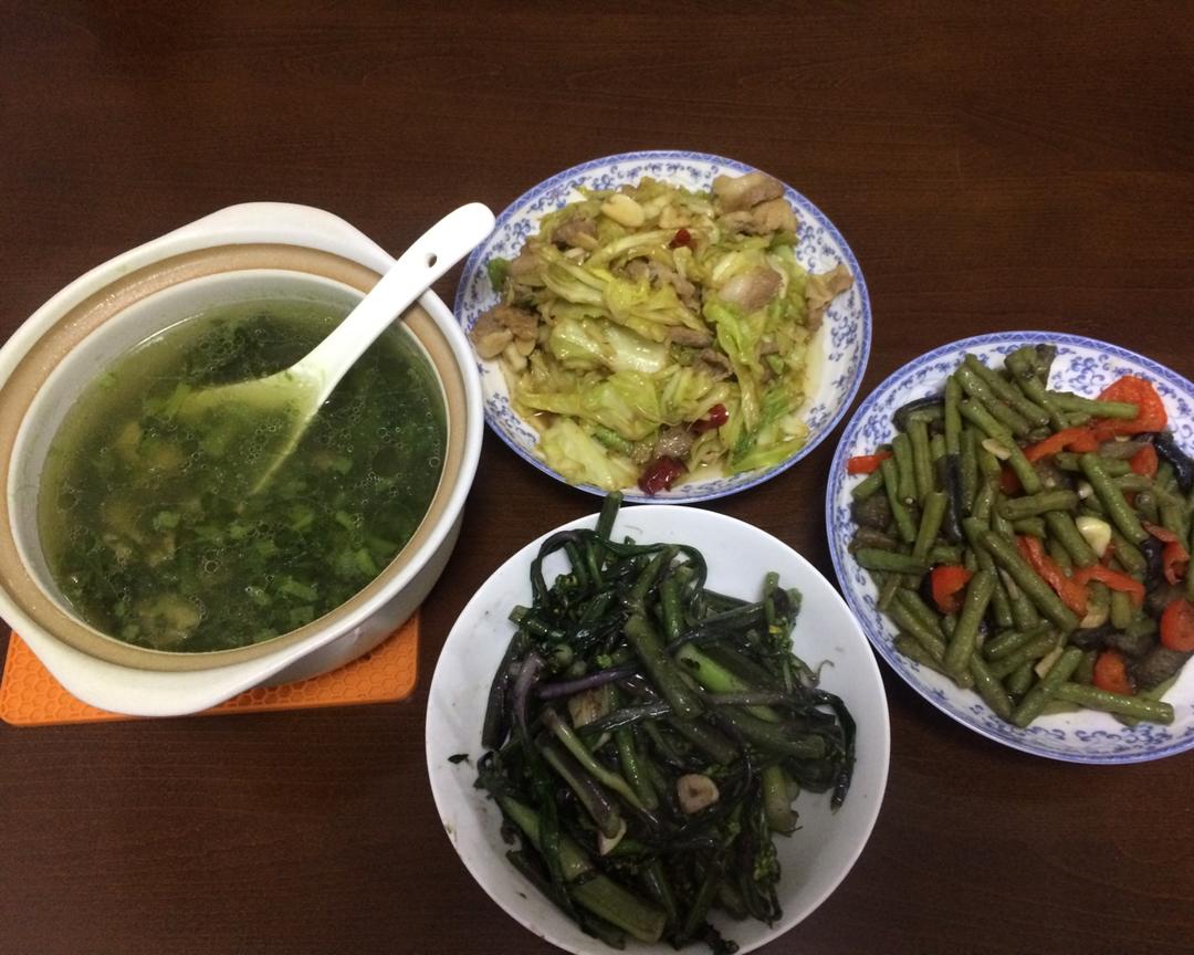 晚上青菜肉末汤,五花肉炒包心菜,豆角烧茄子和紫菜苔。最后只有豆角这个有剩的,可能我没炒好,油放少了,也可能是反季节的菜的...