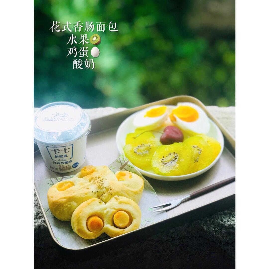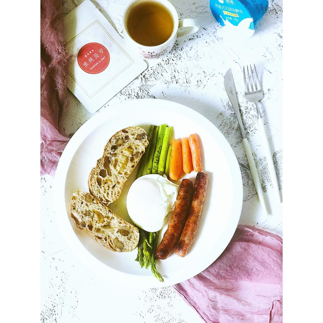法式无花果核桃包+烤香肠时蔬+水波蛋+果茶+希腊酸奶