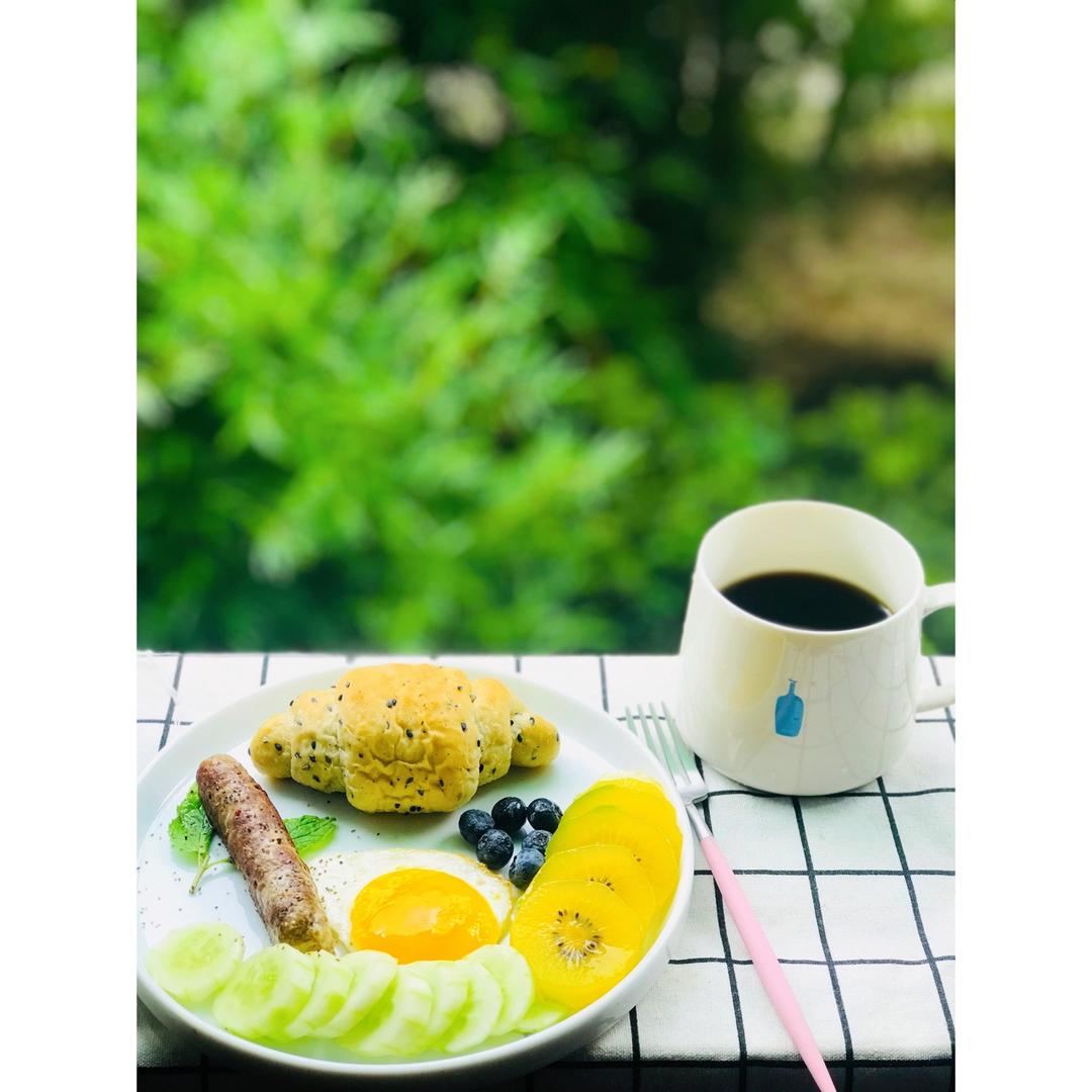 Day1⃣️8⃣️:芝麻盐面包+黑胡椒牛肉肠+煎蛋+水果🥝+咖啡☕️