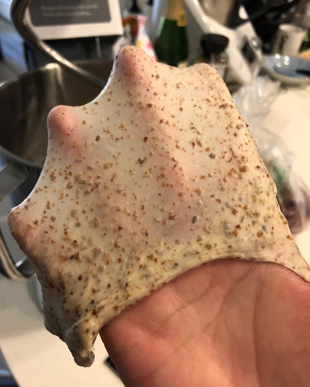 面团好干,要加水。松弛的也不是很足的感觉。下礼拜继续撸。
