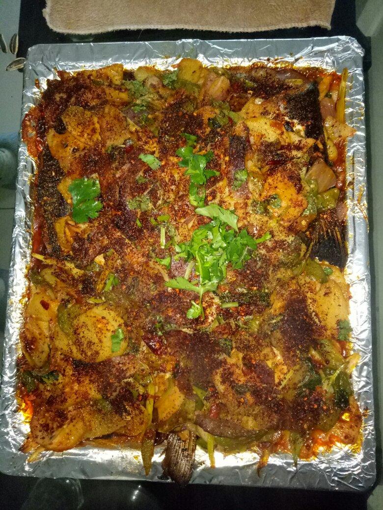 烤鱼,水煮肉片,土豆丝饼,水饺,凉拌皮蛋,口菇腊肉,红烧排骨,红烧茄子。