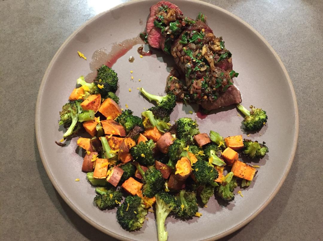 烤甜薯西兰花和煎牛排