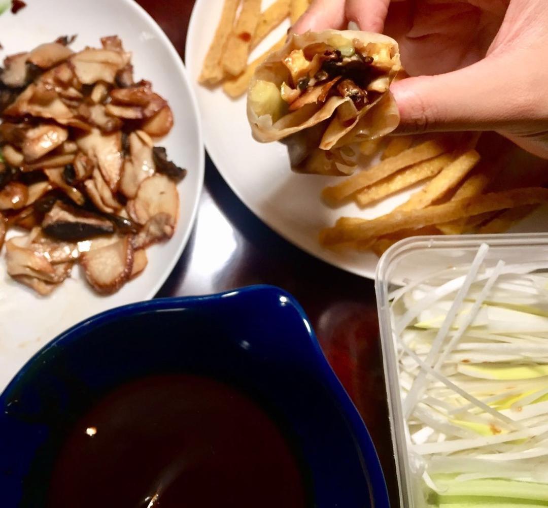用了此方的煎蘑菇,买了烤鸭店的鸭饼和酱料,炸了豆腐干条。真好吃!