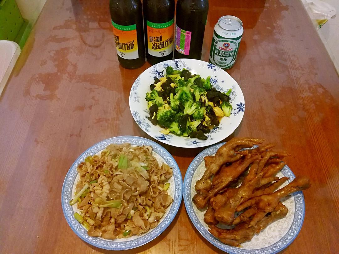 深夜了才想起来发午餐,孜然羊肉炒大葱,素炒西蓝花,一手店买的鸡手,老公中午下班回来要喝啤酒...