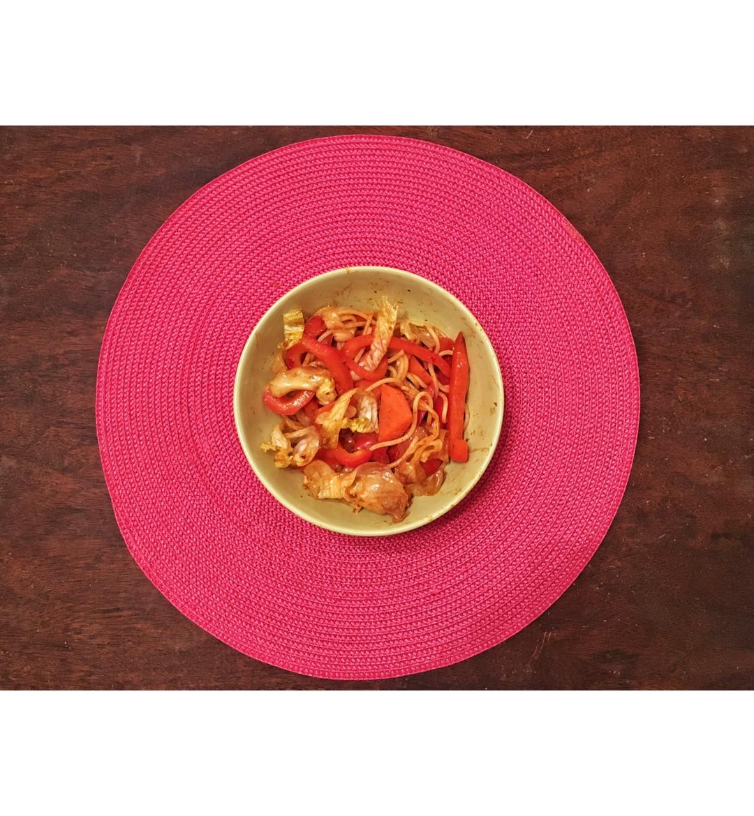 一锅乱炒的sphegetti+甜椒+胡萝卜+生菜+麻婆酱(因为没豆腐所以开始发掘新用途)