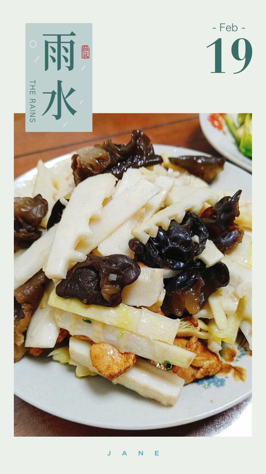 雨水节气宜食笋、韭、荠。昨天在盒马买了春笋和荠菜,今天老爸烹调一桌春色。