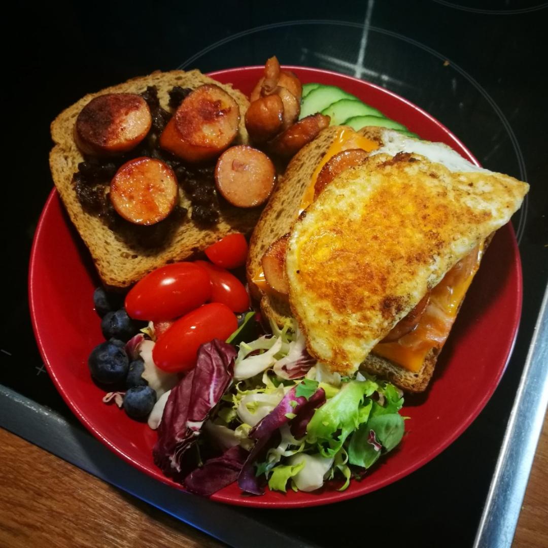 左边是搭配蘑菇酱的蒜蓉烤面包片,右边是芝士三文鱼煎蛋烤面包片,然后搭配一些蔬菜水果