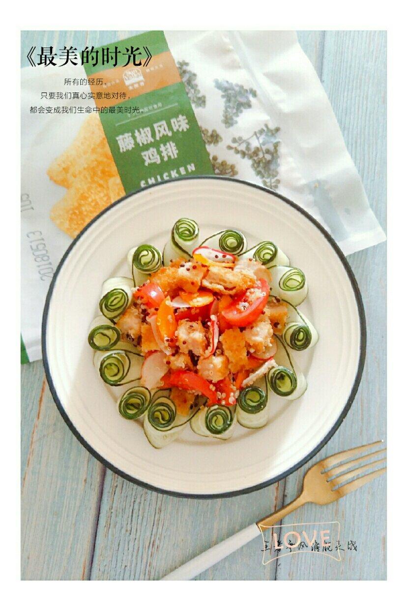 早餐用太阳谷藤椒鸡排拌的藜麦鸡排蔬菜沙拉营养美味。
