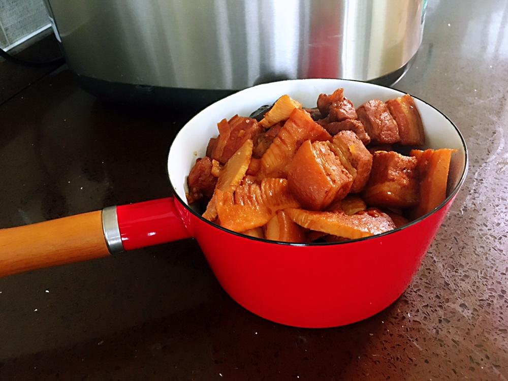 不得不说,偶尔走把捷径真是爽啊😁最后五分钟加把熟菜笋拌匀收汁,色香味都挺给力~不过有一说一,如果不是做过红烧肉知道对调料...