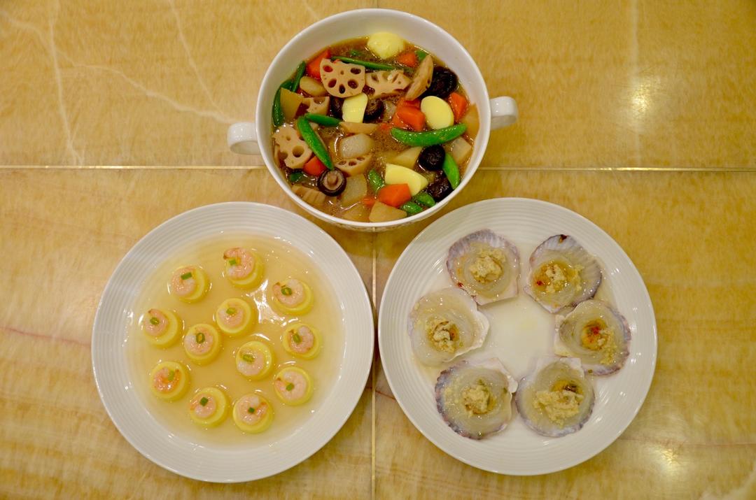 筑前煮、蒜蓉粉丝蒸扇贝、玉子豆腐蒸虾仁。