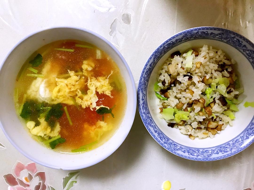 早餐腊肉洋白菜炒饭、番茄蛋汤🍅