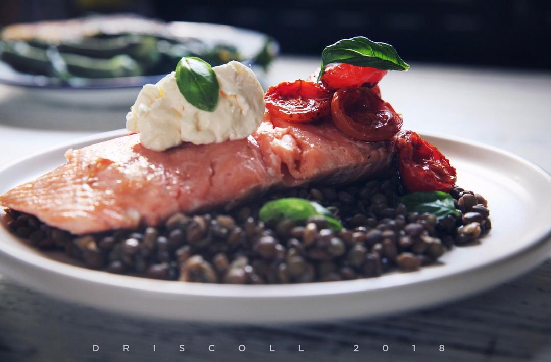 低溫慢煮三文魚伴扁豆烤番茄。三文魚加少許海鹽和橄欖油放入密封袋冷藏至少1小時,52度30分鐘。同時,用雞湯煮熟lenti...