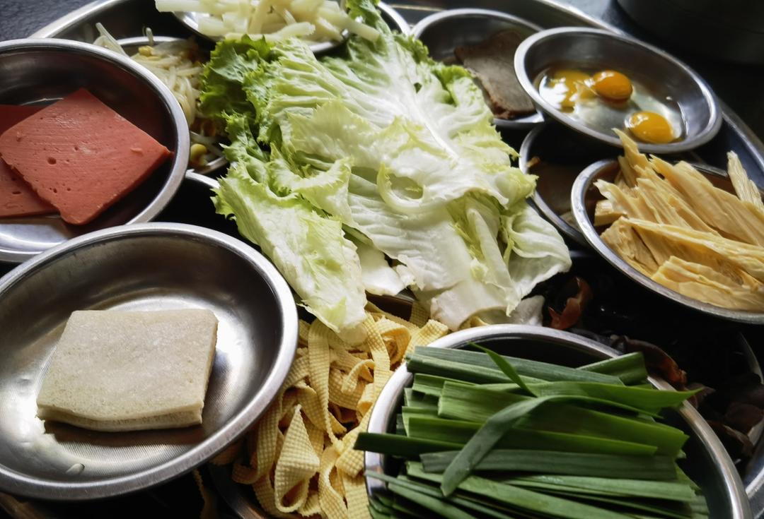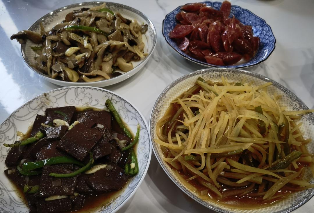 中午吃菜盒子,晚餐:蘑菇,土豆丝,鸭血,腊肠