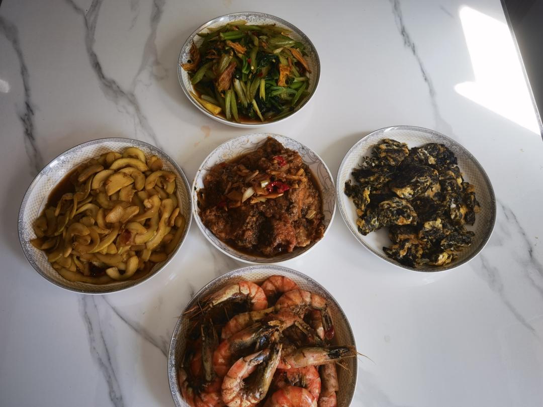 黑虎虾,红烧鱼块,地皮菜炒鸡蛋,芹菜炒肉,葫芦瓜,紫菜蛋花汤