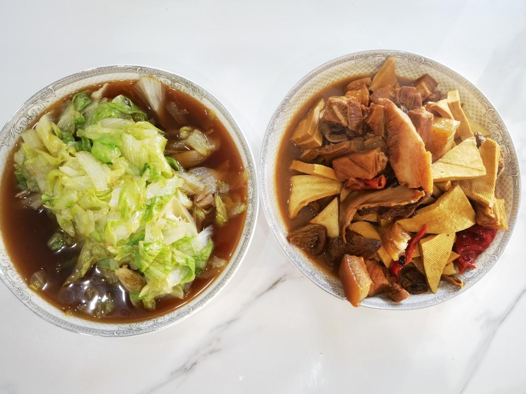 辣皮子炒肉(用了大半瓶雪莲辣椒丝),西红柿炒蛋,用番茄丁,偷懒人的救星,再炒个绿色蔬菜,拌面菜齐了#午餐•2025年4月...