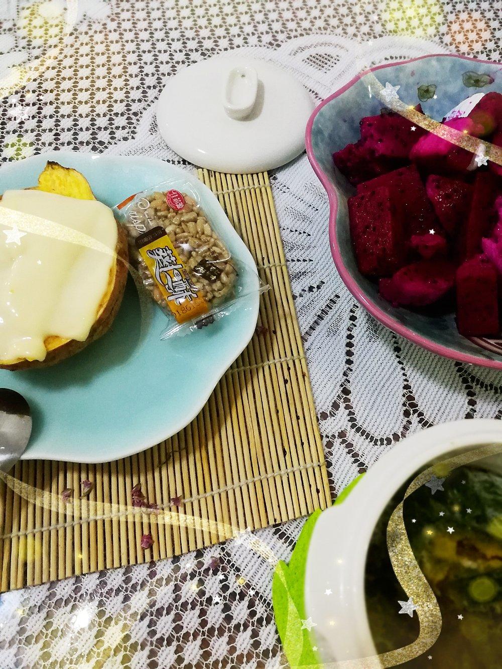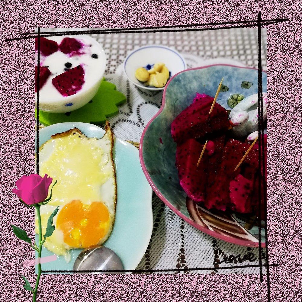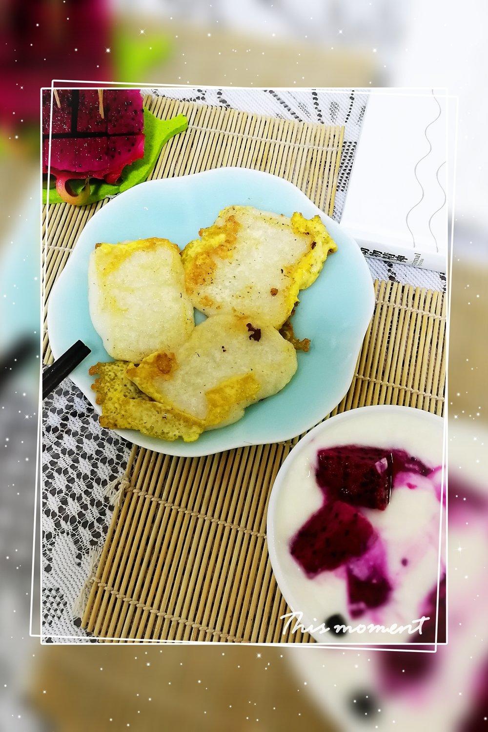 煎糍粑,今天做得椒盐味儿。火龙果酸奶。天热了,自制老酸奶,好喝