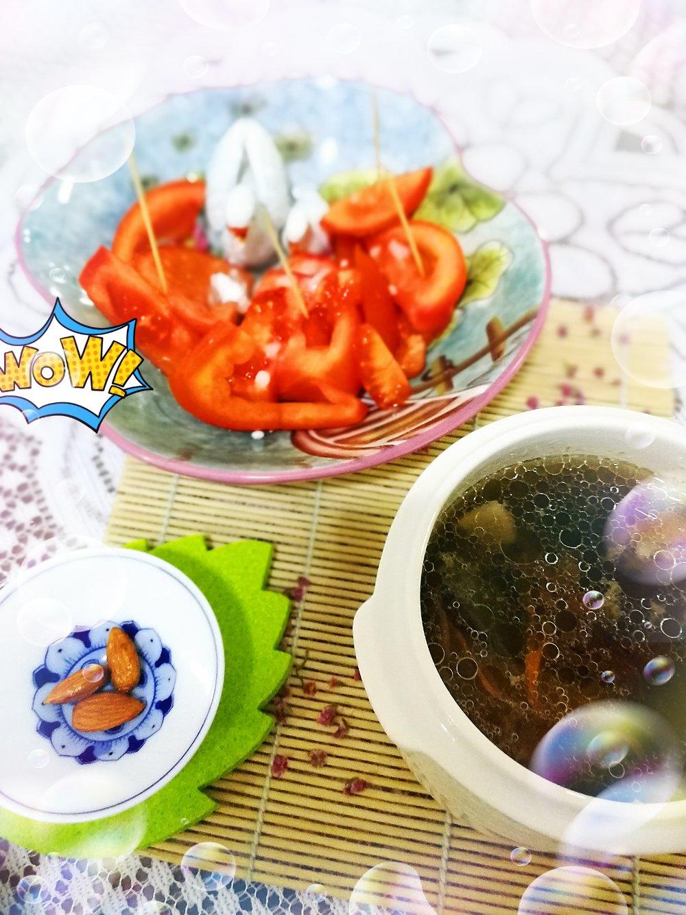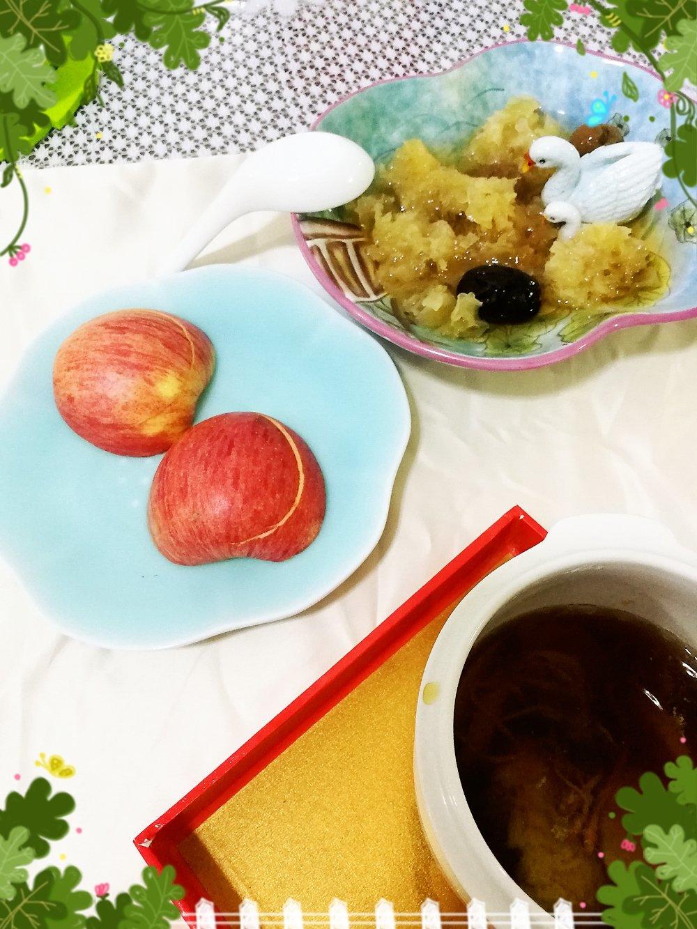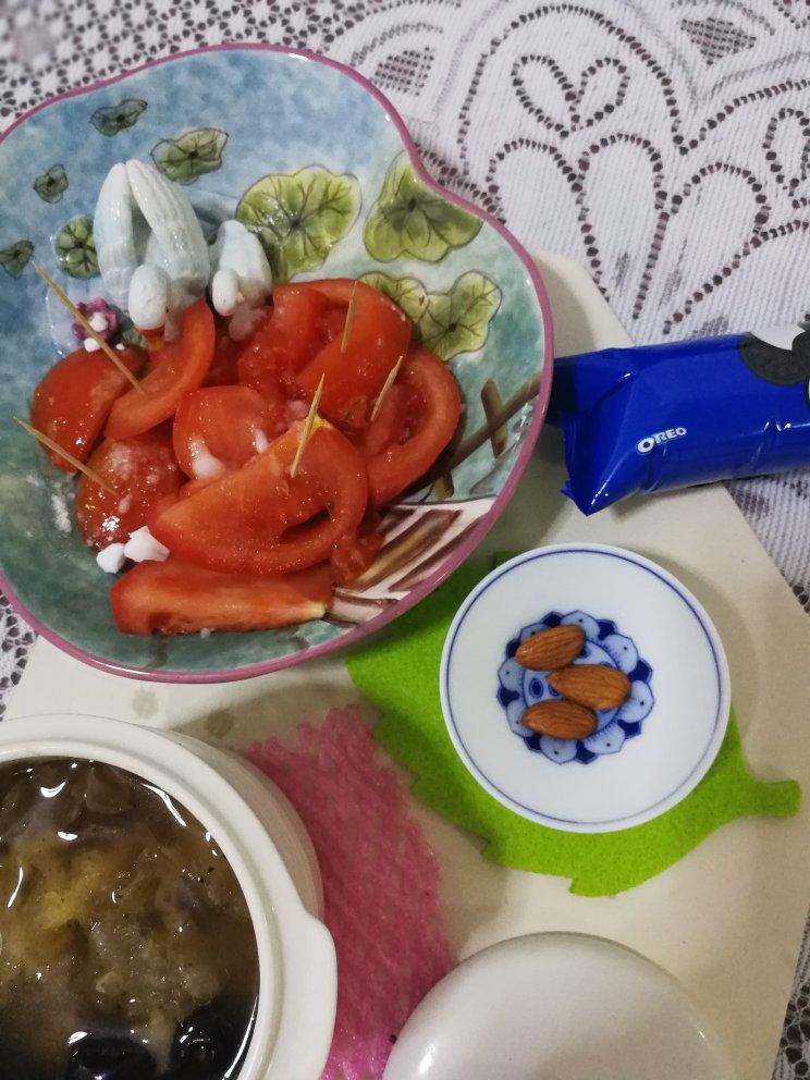 桂圆白木耳汤,糖拌番茄,坚果。木耳汤里扔了几个汤元,😄😄😄