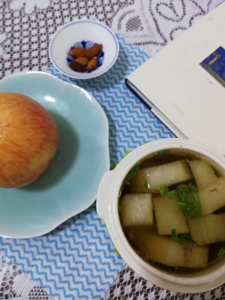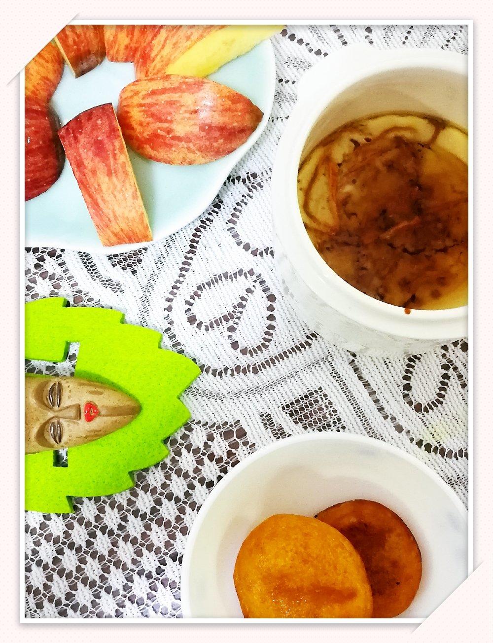 冬瓜老鸭汤,苹果,杏仁。娃说饿,又煎了两块小糍粑,没拍照
