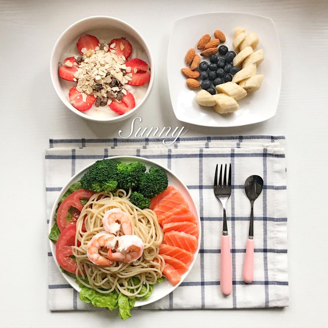 主食:意大利面,水果燕麦片,虾,三文鱼