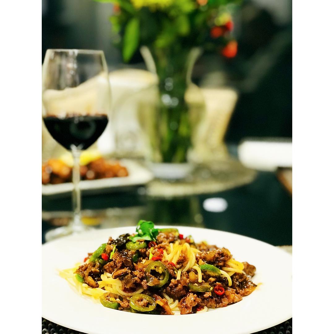 真的好吃极了!我放了好多辣椒🌶️超级好吃哦😋😅 —- 黑椒牛肉意大利面。我没用火腿肠穿面条这个步骤。也没有黑椒酱,一样好...