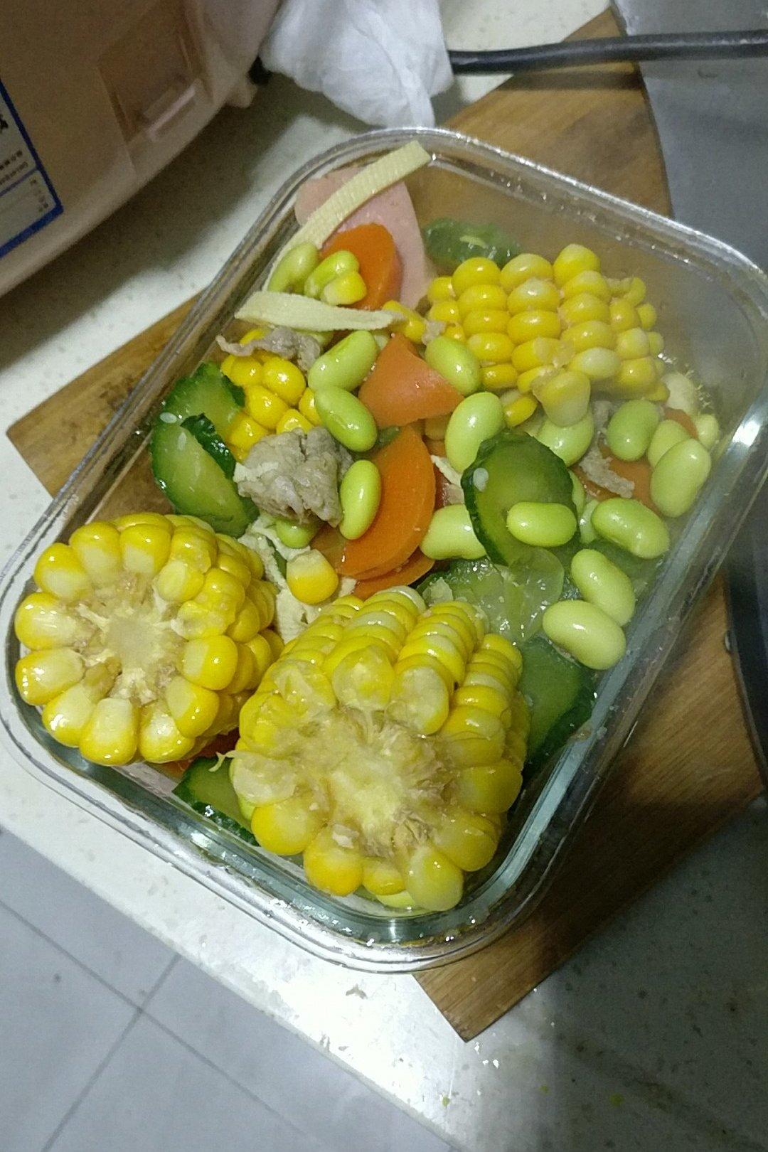 材料:一根大玉米,一把青菜,一把白菜,一根黄瓜。