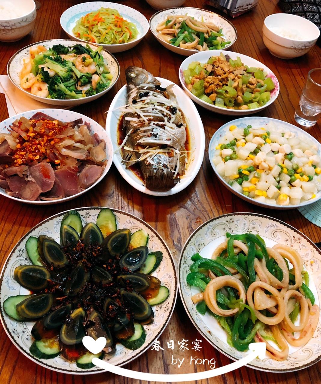 家宴:1.凉拌笋丝2.青椒鲜鱿圈3.虾仁🍤西...
