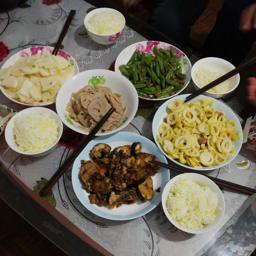烧鲅鱼,春笋炒肉,豆角炒肉,山药,糖醋藕片。大黄米金银饭。#大脸...