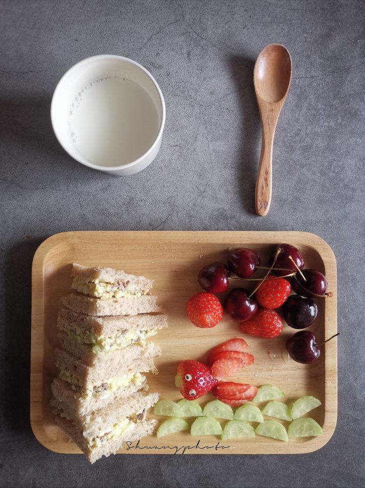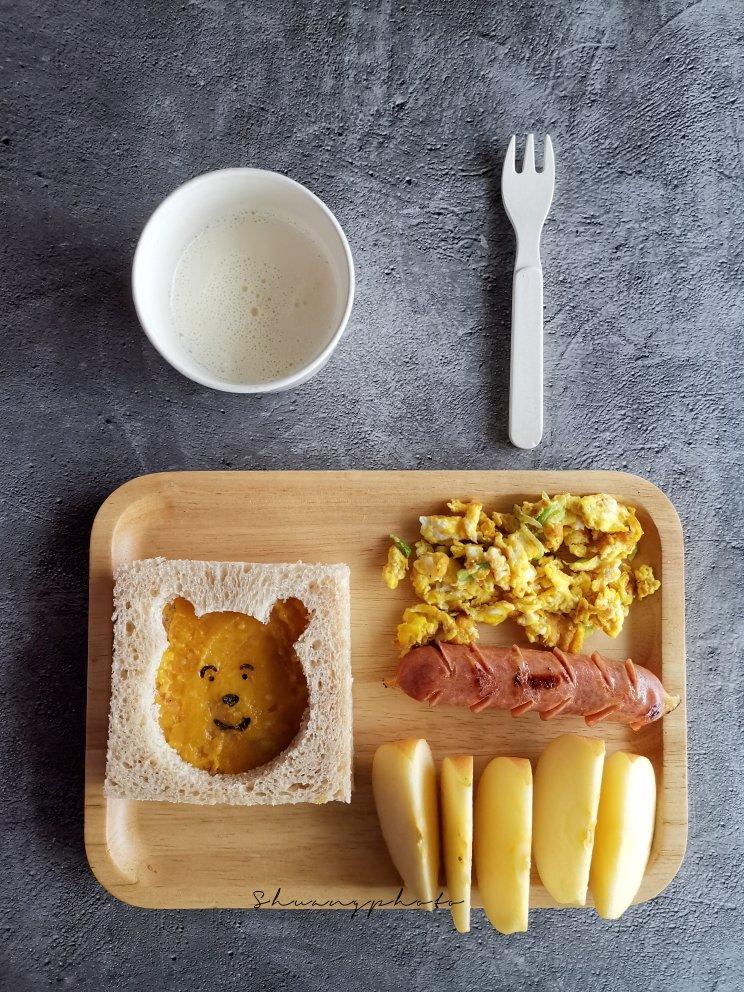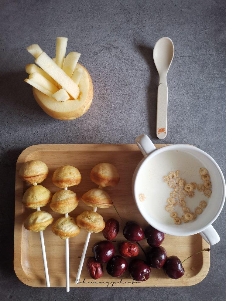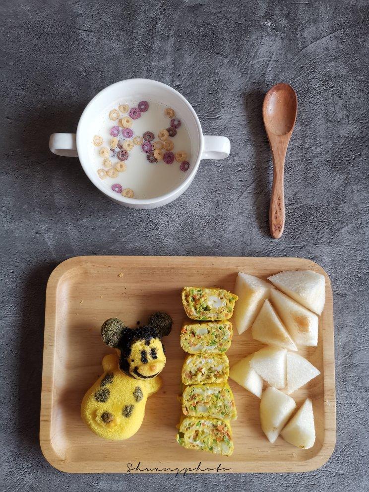 卡通戚风蛋糕、杂蔬厚蛋烧、牛奶、梨