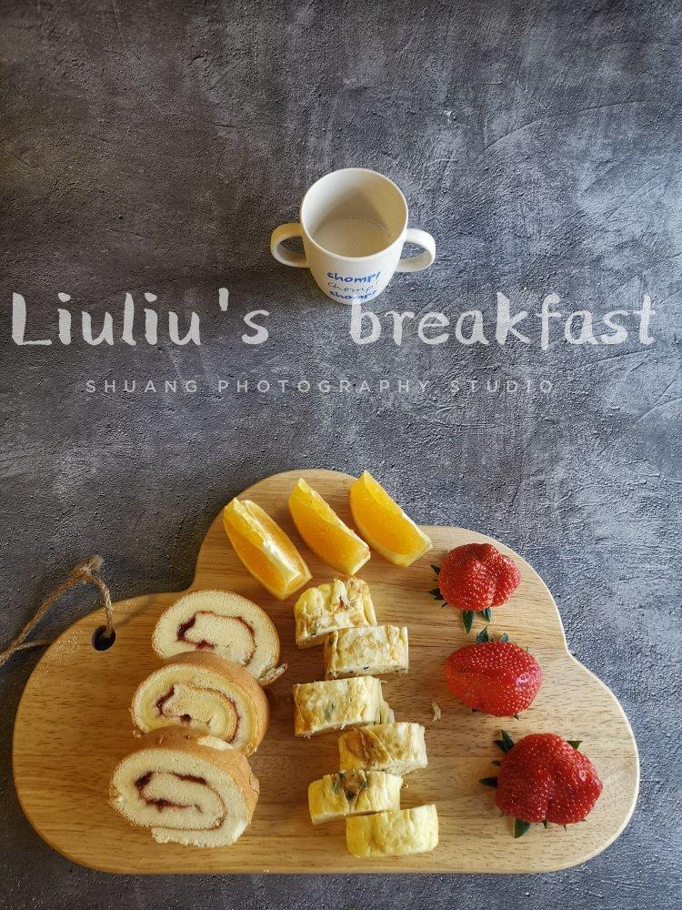 果酱蛋糕卷、肉松厚蛋烧、水果、牛奶