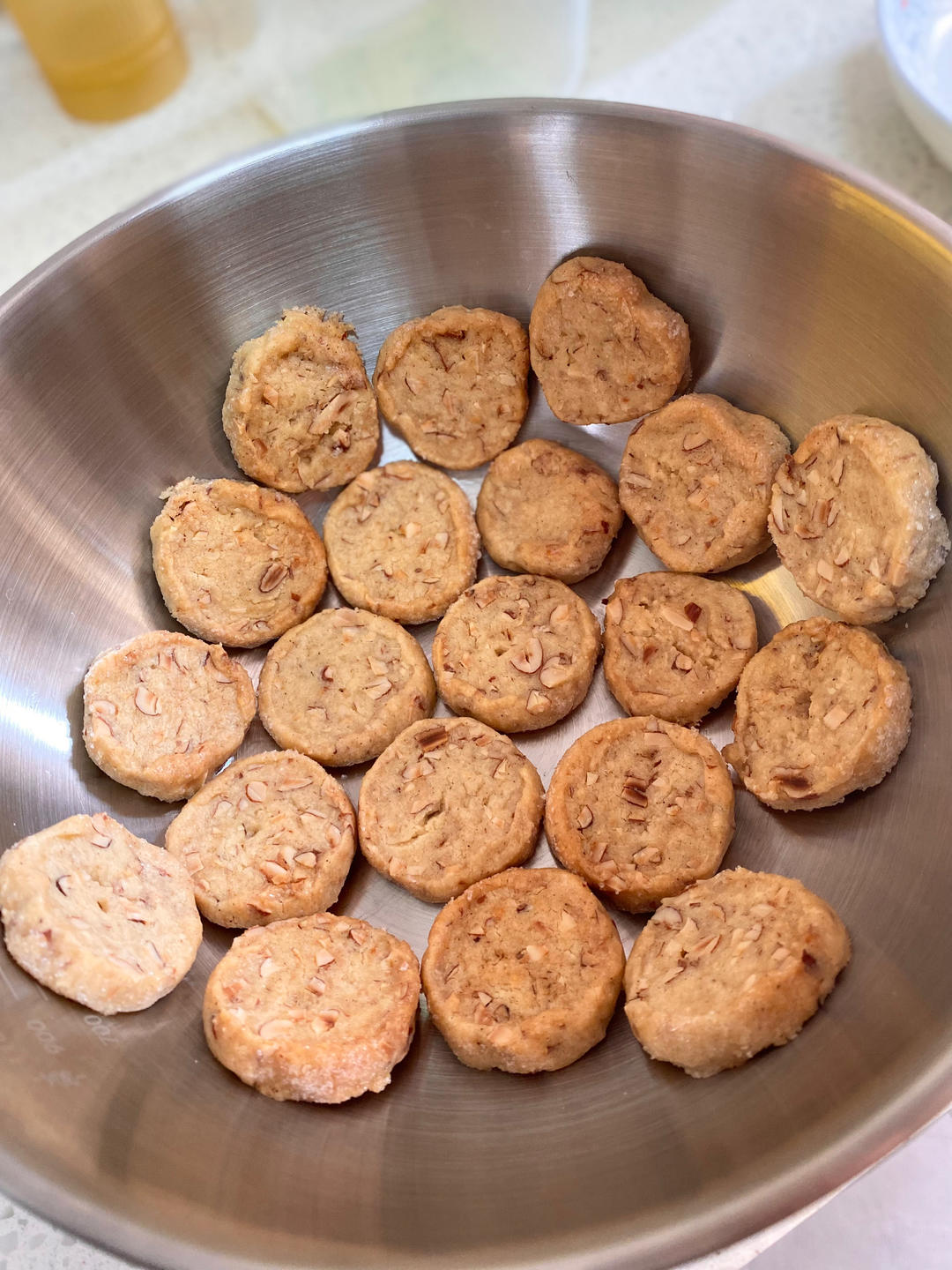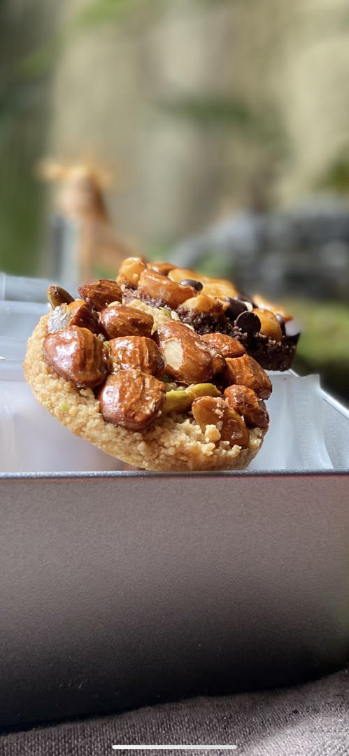 没有杏仁了,就用坚果,我家的长帝上下管烤150度15分钟,再10分钟同150°空气烤。