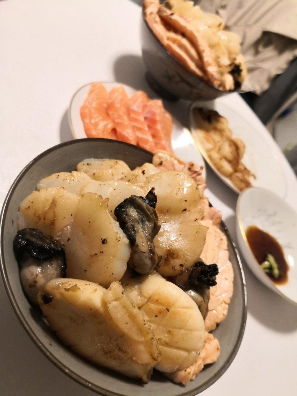 海鲜最适合用黄油香煎~外焦里嫩的半熟三文鱼 带子 生蚝 超赞~