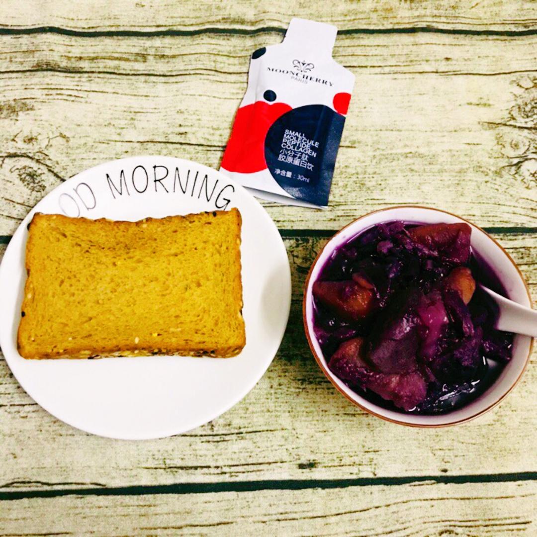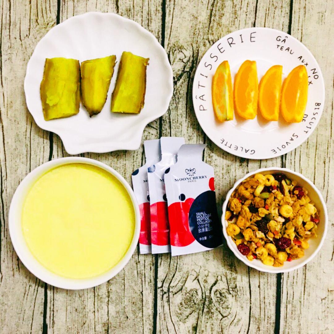 番薯切片和炖蛋一起蒸,切个橙子,倒碗水果坚果烤麦片,来包小分子肽,搞...